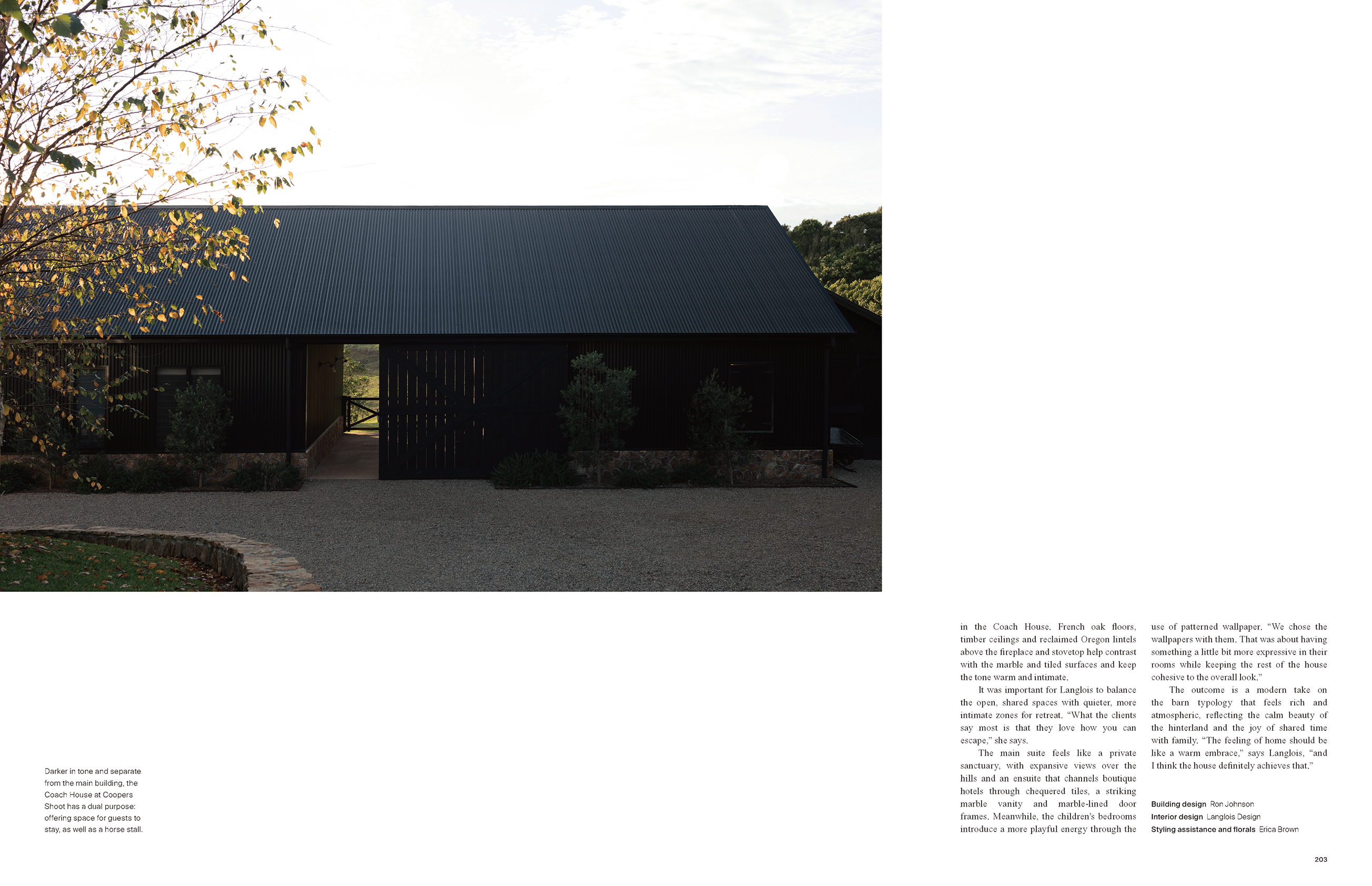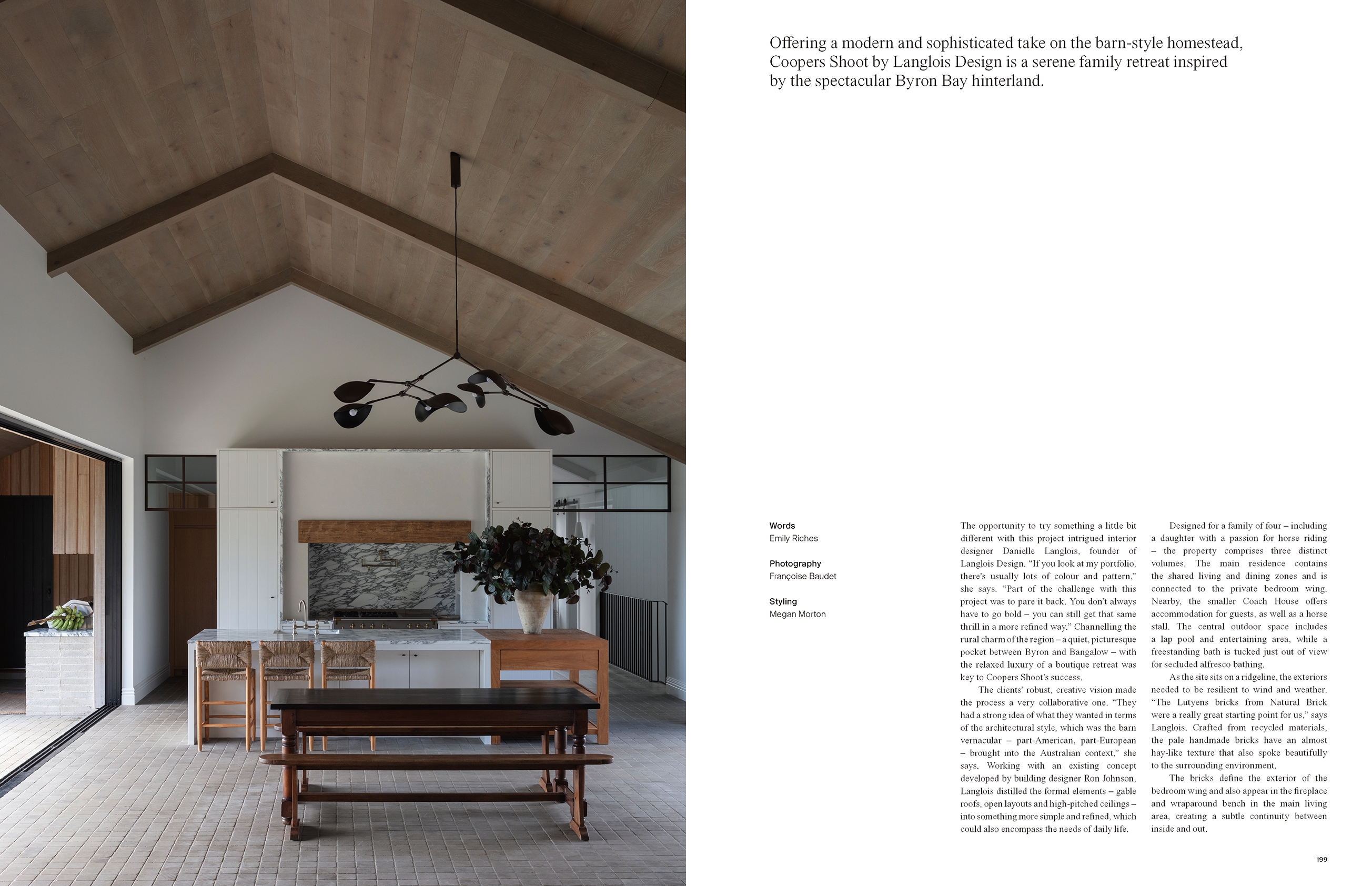 Featured in The Local Project, Project Coopers is a modern interpretation of the rural barn homestead set within the Byron Bay hinterland. The interiors balance raw and refined elements—reclaimed timber, marble, aged brass and bluestone—layered to create warmth and quiet drama. Bespoke joinery and handcrafted details bring character to the expansive volumes, while a considered palette softens the architecture. The result is a home that feels both refined and relaxed, shaped by its landscape and designed for shared family living.