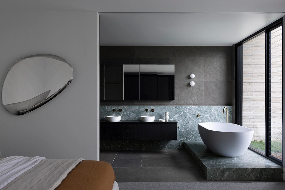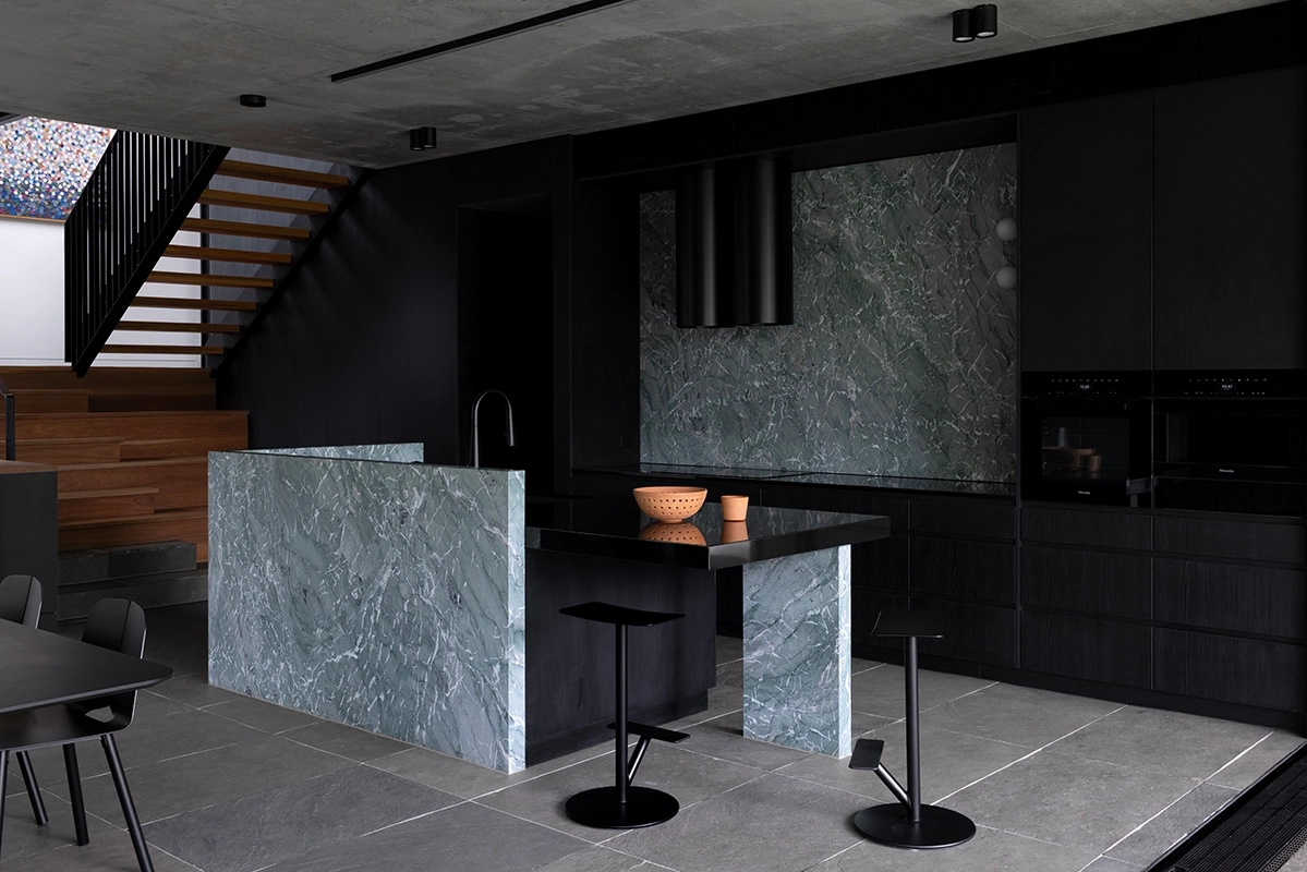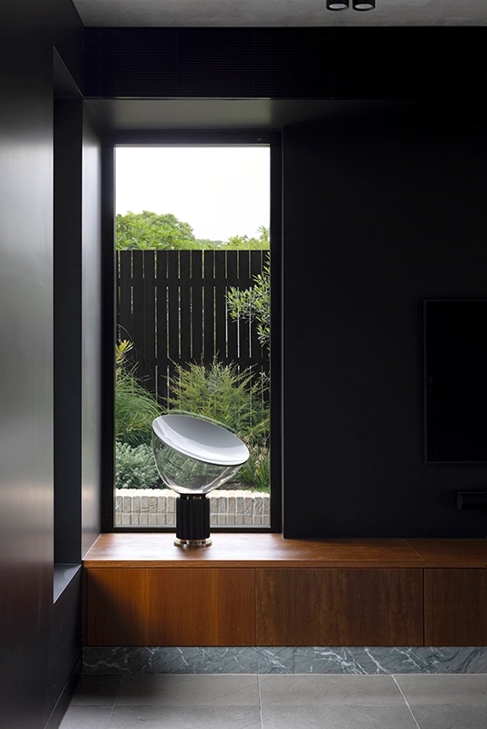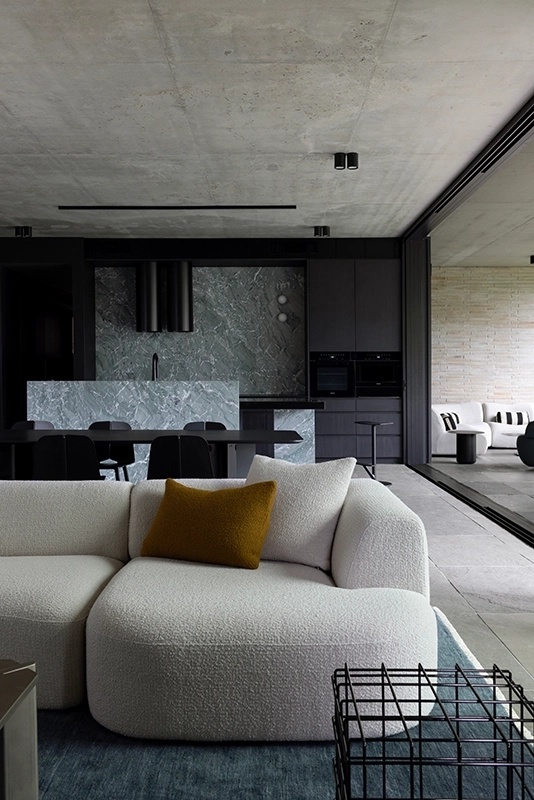 The architecture guides the decoration at every turn. Open-plan living areas are anchored by low, generous furniture that reinforces the home’s horizontal lines and relaxed rhythm. In the kitchen and living spaces, bold stone surfaces and dark finishes are offset by tactile materials and subtle colour moments, creating interiors that feel layered yet easy.
