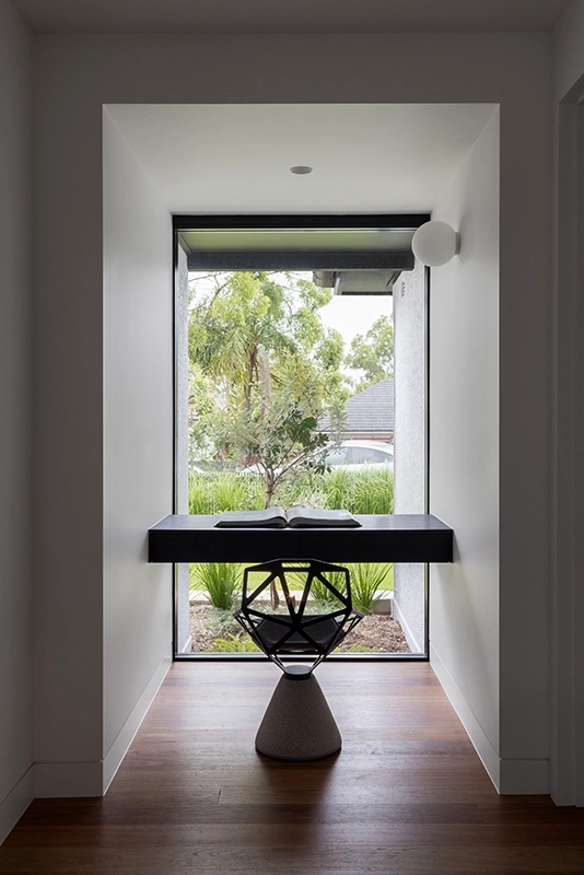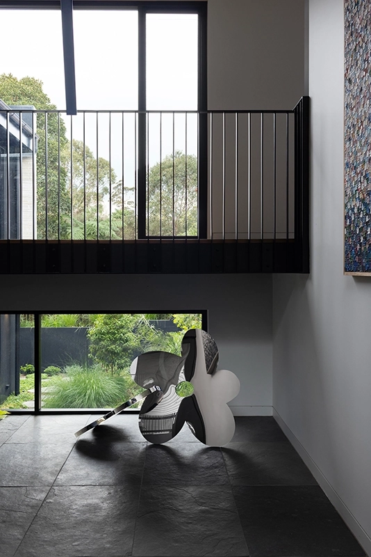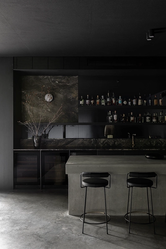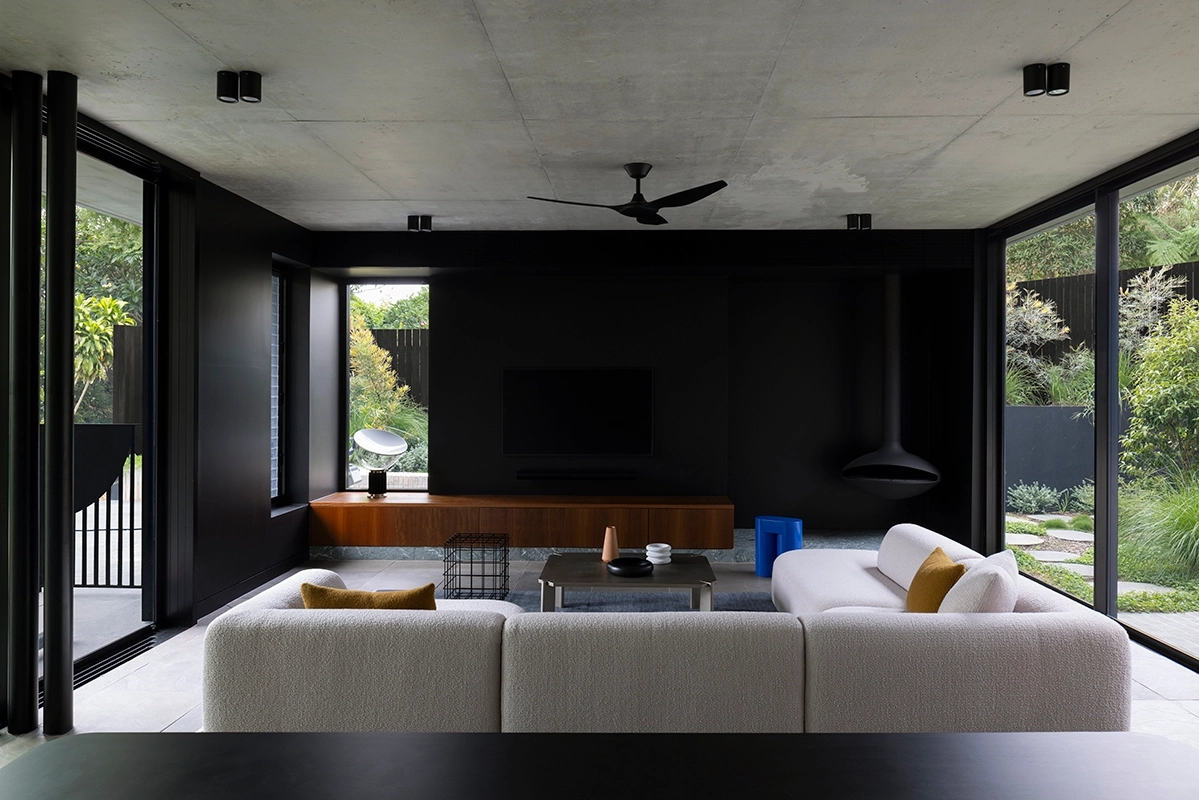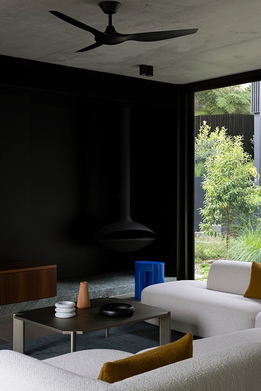 A strong architectural framework underpins this home, with concrete ceilings, dark joinery and finely detailed brickwork creating a calm, moody backdrop throughout. The Interior decoration responds intuitively to this setting, balancing structure with softness and allowing the spaces to feel both grounded and welcoming.