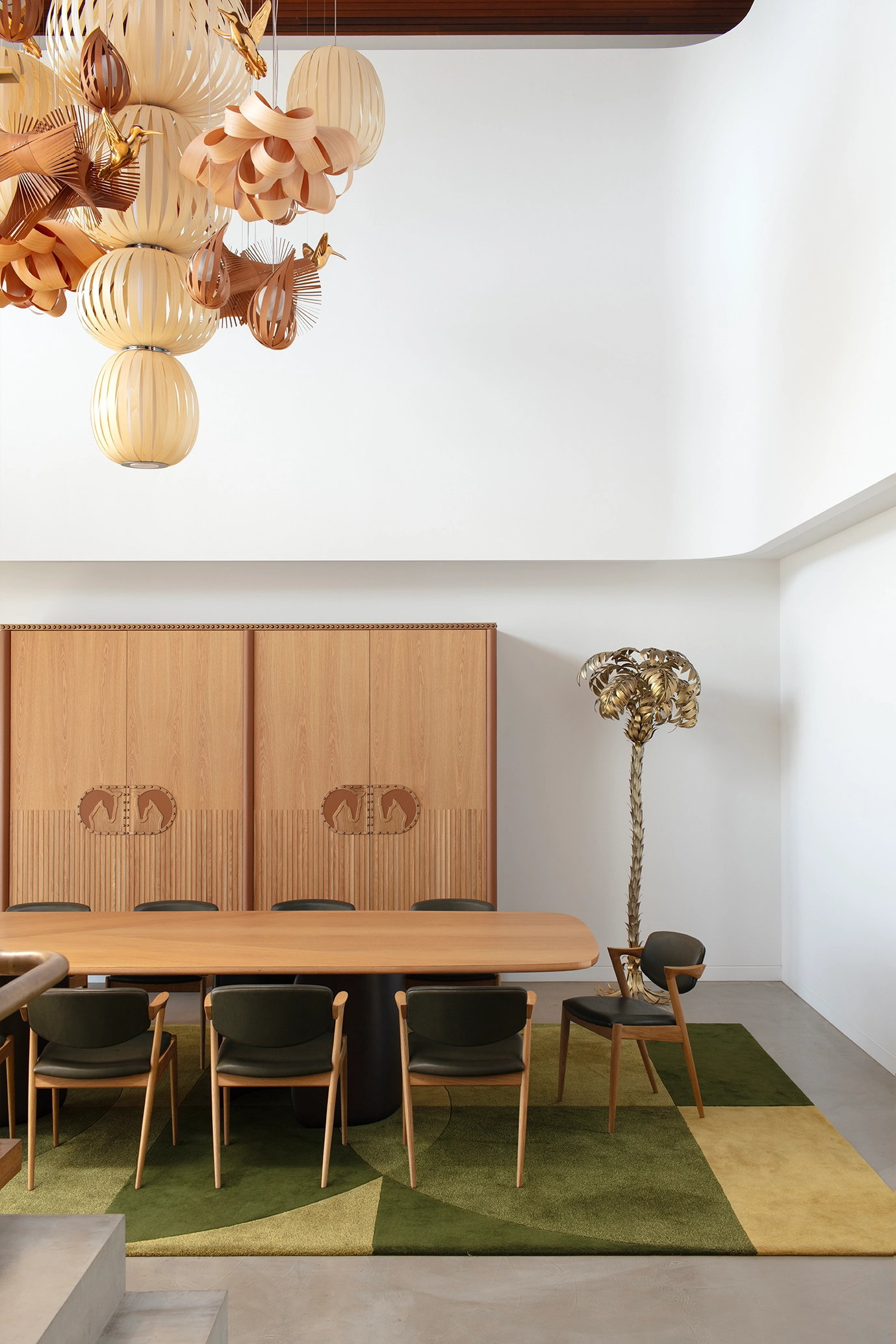 Generous lounges in plush velvet invite connection, their sculptural form anchoring expansive living zones. Bespoke joinery and curated shelving provide both function and quiet elegance, while statement lighting introduces an artistic, atmospheric quality. Rugs—playful in motif yet refined in tone—tie the spaces together with subtle character.