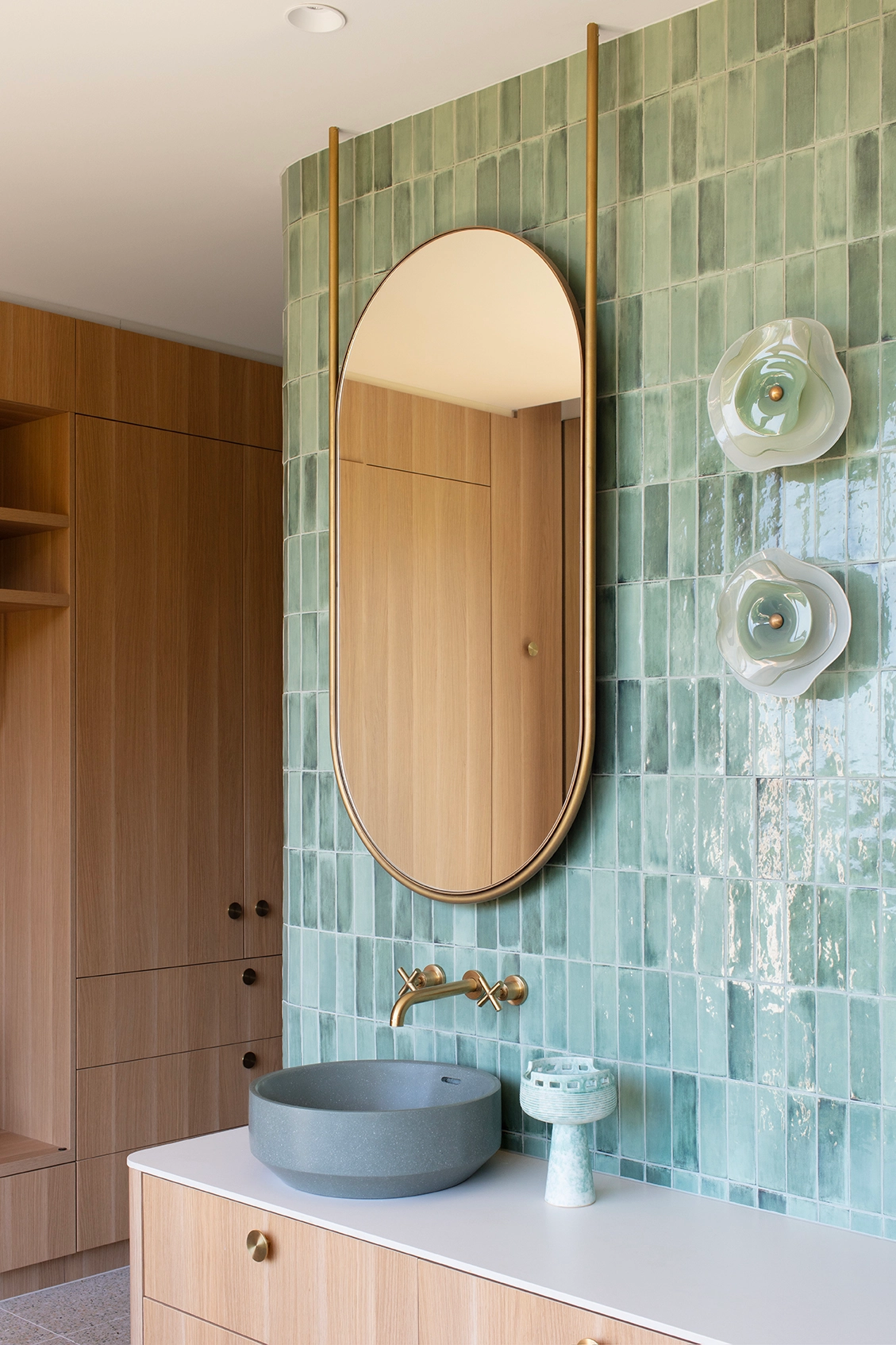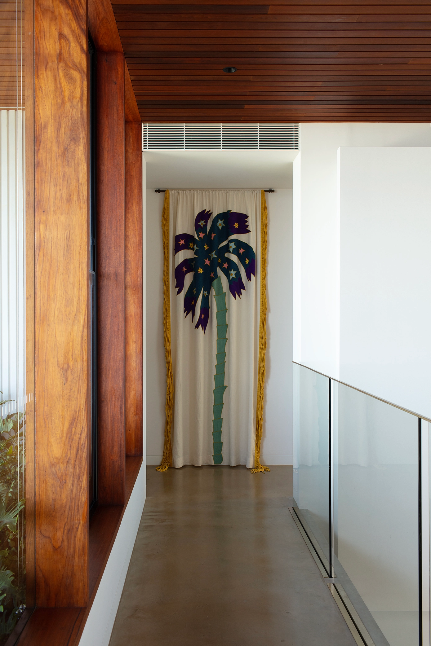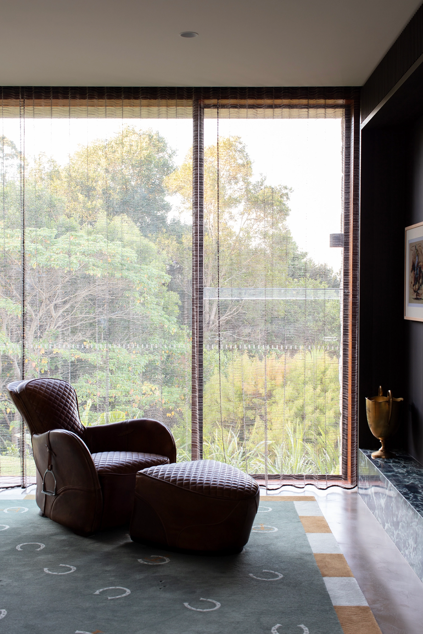 This home is defined by its bold architectural form, softened through interiors that embrace warmth, texture, and balance. Rich timber ceilings and stone walls set the foundation, while bespoke furniture and layered finishes bring a sense of depth and ease to each space. The palette leans into earthy greens, natural leathers, and tactile fabrics, creating interiors that feel grounded yet sophisticated.